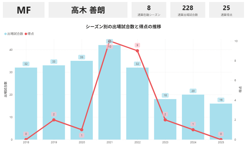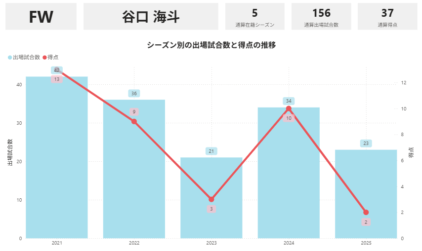 2018年にヴェルディから完全移籍で加入後、途中ひざのケガで離脱したタイミングもありましたが、今シーズンまでコンスタントに結果を残してきた選手。当時J2だった2021年シーズンにキャリアハイの10得点を記録します。また、2022年シーズンも9ゴールとJ2優勝、J1昇格に貢献しました。