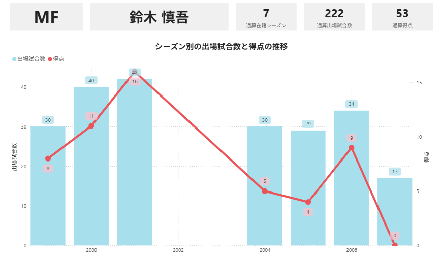 第2位は、みんな大好き鈴木慎吾。正直ここまで上位だとは思っていませんでした。すいません。鈴木慎吾は、1999年に新潟へ加入。2001年シーズンには16得点を決め、翌年の2002年シーズンからはJ1の京都へレンタル移籍。新潟のJ1初年度となる2004年に新潟へ復帰します。試合へはコンスタントに出場を重ね、2006年シーズンにはJ1でのシーズン最多得点の9ゴールを上げます。