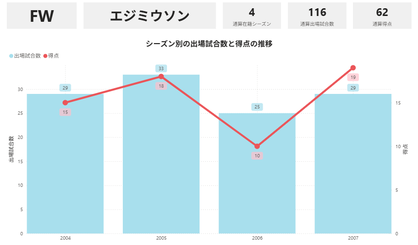 1位は、やっぱりこの人ですよね。エジミウソン。2004年に期限付き移籍で新潟へ加入。4シーズン在籍して、リーグ戦116試合で62ゴールを量産しました。