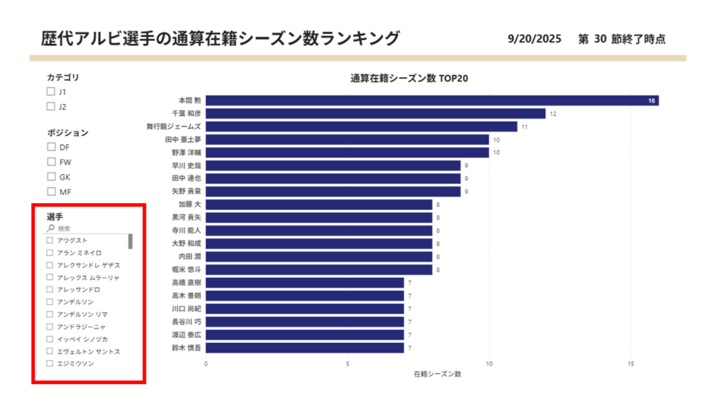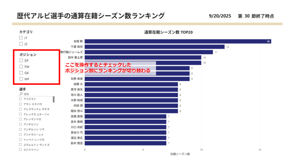 このレポートには、左側にスライサーとよばれるフィルタを用意しています。ポジション別でランキングを表示したい場合は、見たいポジションにチェックを入れることで、ポジション別の在籍シーズン数を表示することができます。